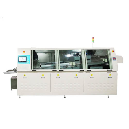 PCB's met gemonteerde componenten worden automatisch in het ketenconveyor-systeem gevoerd en gaan door middel van fluxspraying, voorverhitting, golfsoldering en koeling voordat ze het systeem verlaten.
